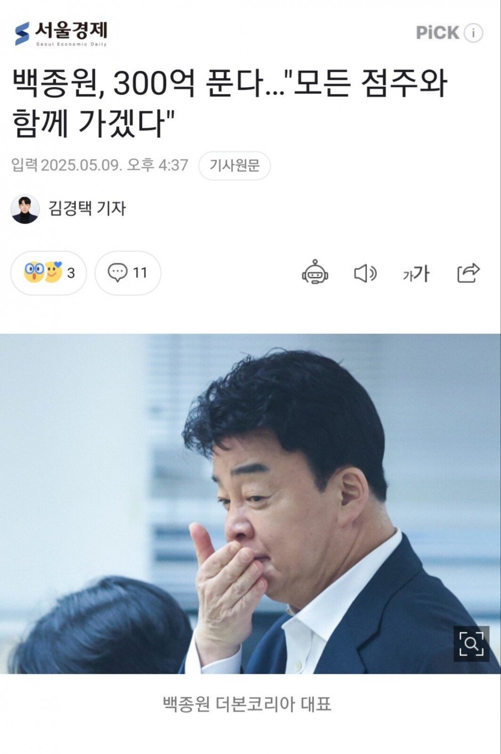 백종원, 300억 푼다..."모든 점주와 함께 가겠다"