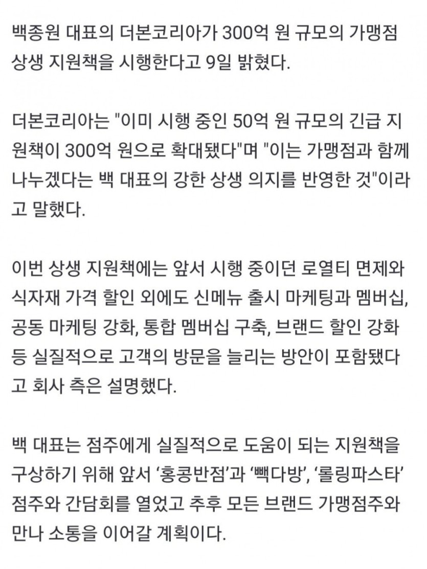 백종원, 300억 푼다..."모든 점주와 함께 가겠다"
