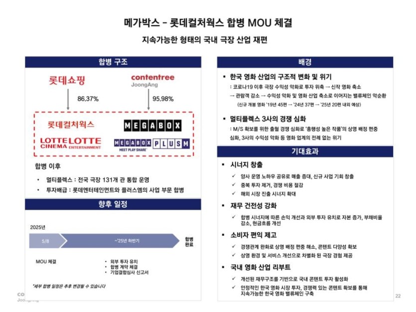 메가박스 + 롯데시네마 합병 내용 rh1 0 98 0 2025.05.09 22:15 한 영화관으로 합치는건 아니고 걍 공동투자 인듯관건은 합병후 131개라는게 합쳐서인지 따로인지위탁은 안센건지 궁금하네 0