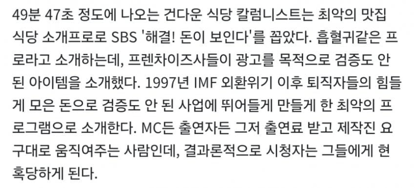 유튜브에서 백종원 자꾸 저격하는 PD 정체 rh1 0 165 0 2025.05.09 12:15 유튜브에 백종원 취재 영상 올리며 어그로 잔뜩 끌린 PD2011년 '트루맛쇼'라는 다큐멘터리 영화를 낸 적이 있다.대충 가짜 식당을 차려서 맛집 촬영하는공중파 TV프로그램들의 행태를 낱낱이 밝혀내는 다큐 영화임이 PD가 이런 TV 맛집 프로그램들을 극혐하는 이유가 뭐였을까?악덕 업주들이 방송PD들에게 뒷돈 주고 출연해서프렌차이즈 창업자를 끌어모으는데 사용했기 때문.... 유튜브에서 백종원 자꾸 저격하는 PD 정체 0