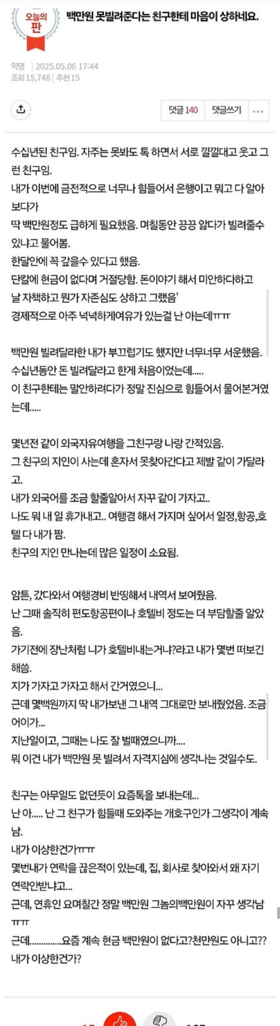 백만원 못빌려준다는 친구한테 마음이 상하네요