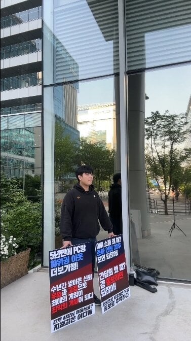 경남 창원에 사는 로스트아크 유저이자 스트리머 라데는 아침 7시부터 판교 스마일게이트 본사 입구 근처에서 1인 시위를 진행하기 시작함