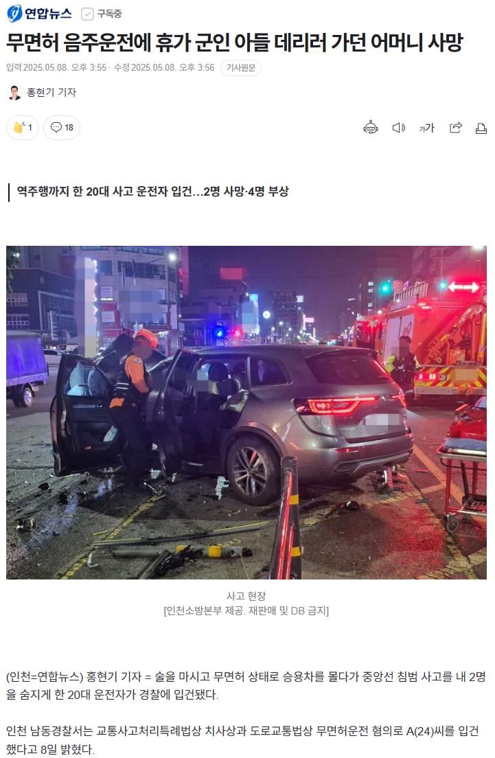 무면허 음주운전에 휴가 군인 아들 데리러 가던 어머니 사망 rh1 0 150 0 2025.05.08 18:00 사고 당시 A씨가 몰던 승용차는 왕복 8차로 도로에서 중앙선을 넘어 역주행하다가 SUV와 충돌했다.A씨는 앞서 음주운전으로 적발돼 면허 정지 기간인데도 재차 술을 마시고 무면허로 승용차를 운전한 것으로 조사됐다.진짜 무슨 말도 안되는군인 아들은 세상이 멸망하는 기분이겠네 0