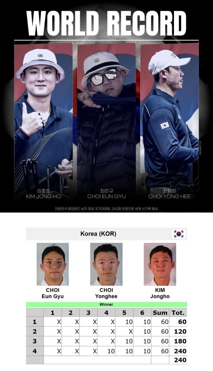 고일대로 고여버린 한국 양궁 대표팀 근황 (컴파운드) rh1 0 180 0 2025.05.08 11:15 상하이에서 열리는 2025 현대 양궁 월드컵 2차 대회 에서양궁 컴파운드 한국 대표팀이 24발의 화살 전부 10점을 쏴서240점 만점의 세계신기록을 세움 0