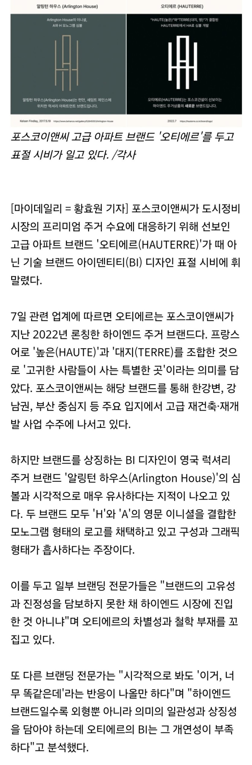 포스코 명품 아파트 브랜드 '오티에르' 표절 논란