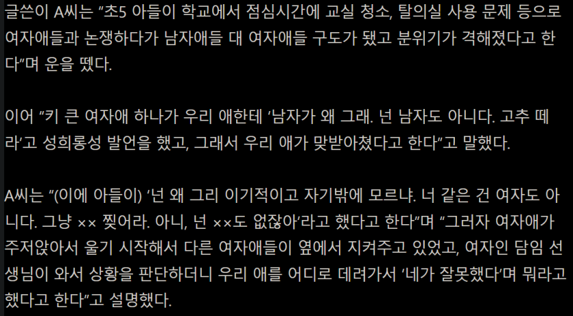‘고추 떼라‘는 말에 ‘XX 찢어‘ 하니 선생님이 아들만 혼냈다네요 rh1 0 126 0 2025.05.07 00:15 https://news.nate.com/view/20250126n02646 0