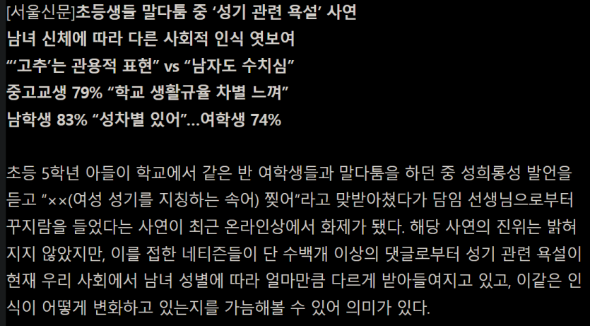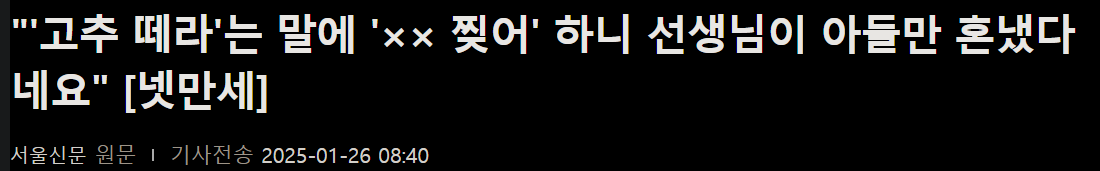 ‘고추 떼라‘는 말에 ‘XX 찢어‘ 하니 선생님이 아들만 혼냈다네요 rh1 0 96 0 2025.05.07 00:15 https://news.nate.com/view/20250126n02646 0