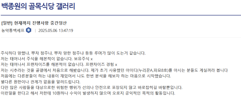 담당일진 농약통맨이 백종원 파묘를 시작한 이유.jpg rh1 0 136 0 2025.05.06 17:15 처음에는 "재밌어서"지금은 공익목적이라 함이사람은 백종원 관련 민원을 한달 좀 넘은 기간동안 72개 넣었다 0