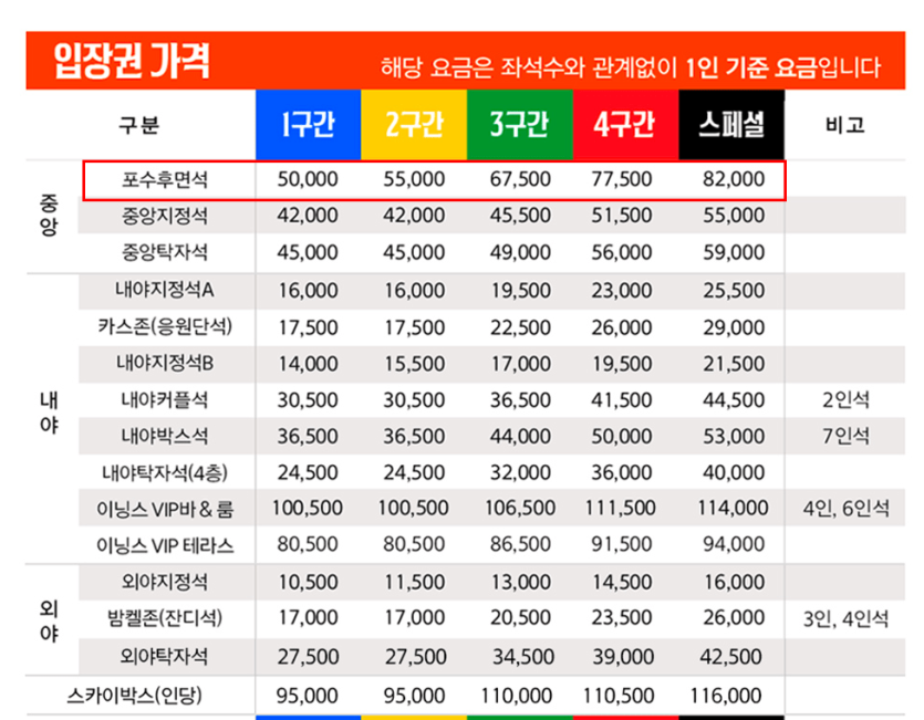 우선 예매한 자리는 스페셜구간 요금 82,000원짜리 포수후면석 3루쪽 좌석이었음.