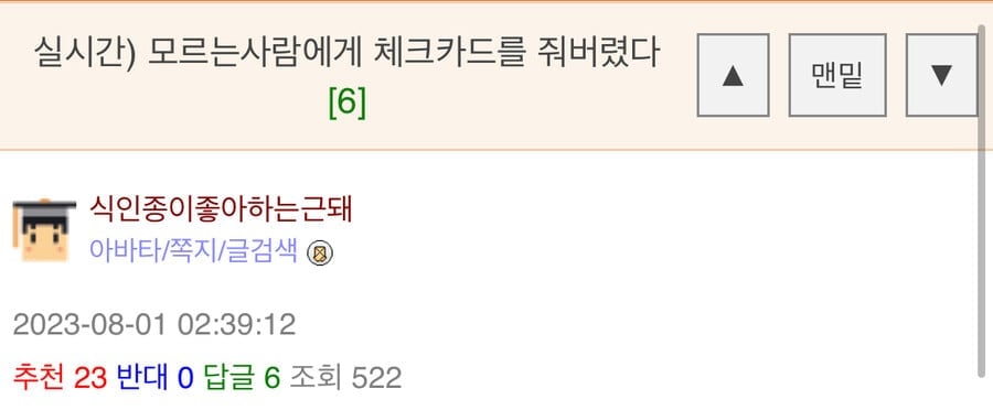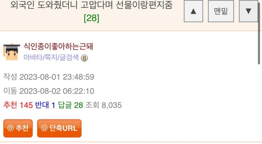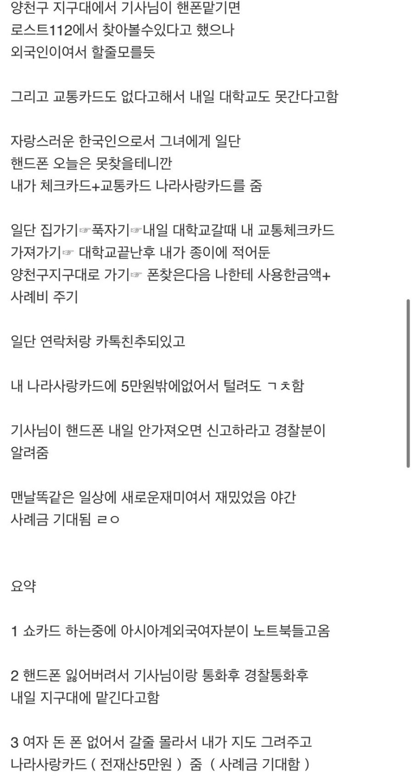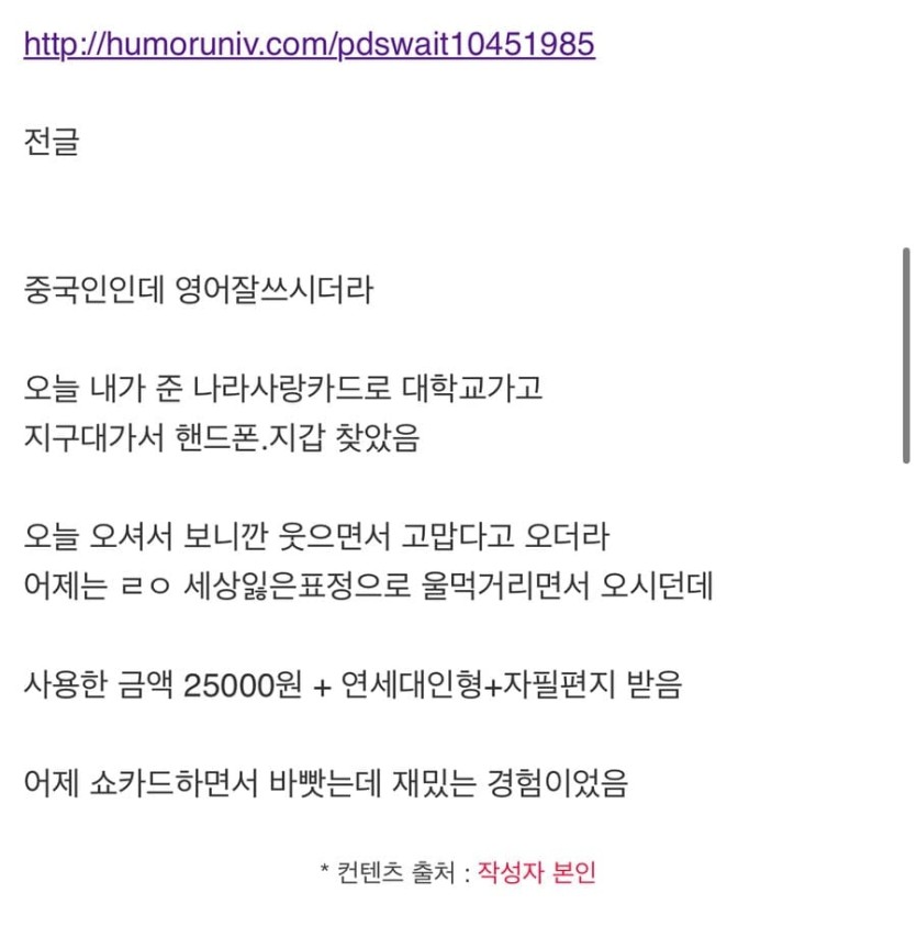 도와달라는 외국 여자에게 자기 체크카드 준 웃대인 rh1 0 97 0 2025.05.06 15:15 사례비 돌려받고 선물이랑 편지도 받음 훈훈 도와달라는 외국 여자에게 자기 체크카드 준 웃대인 0