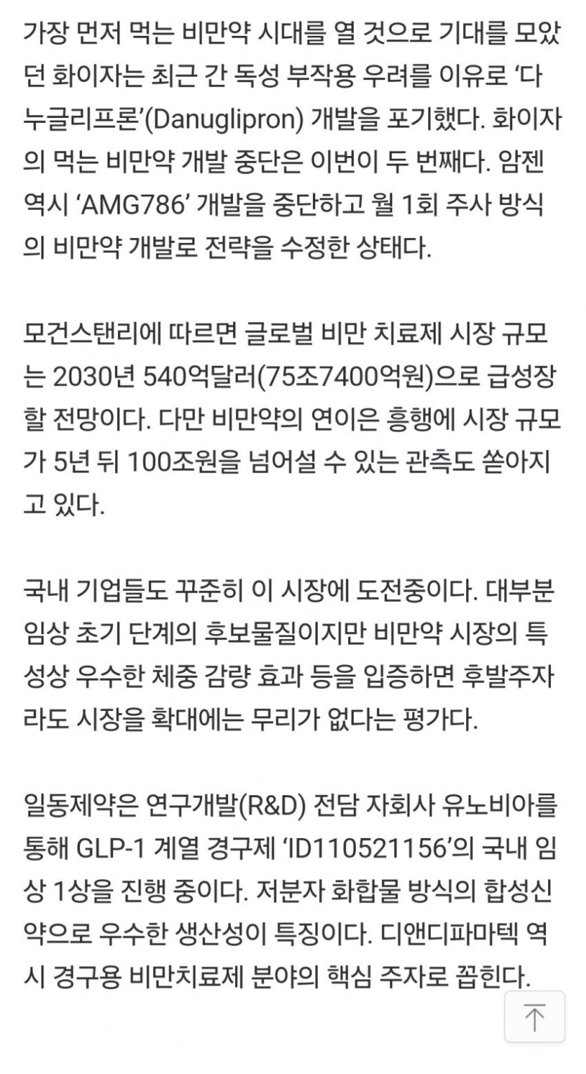 • 기존 주사제 GLP-1 기반 치료제의 복약 편의성 문제를 해결할 경구제 출시가 임박하여, 2030년 75조원 규모로 예상되는 시장의 성장이 더욱 가속화될 전망이다.