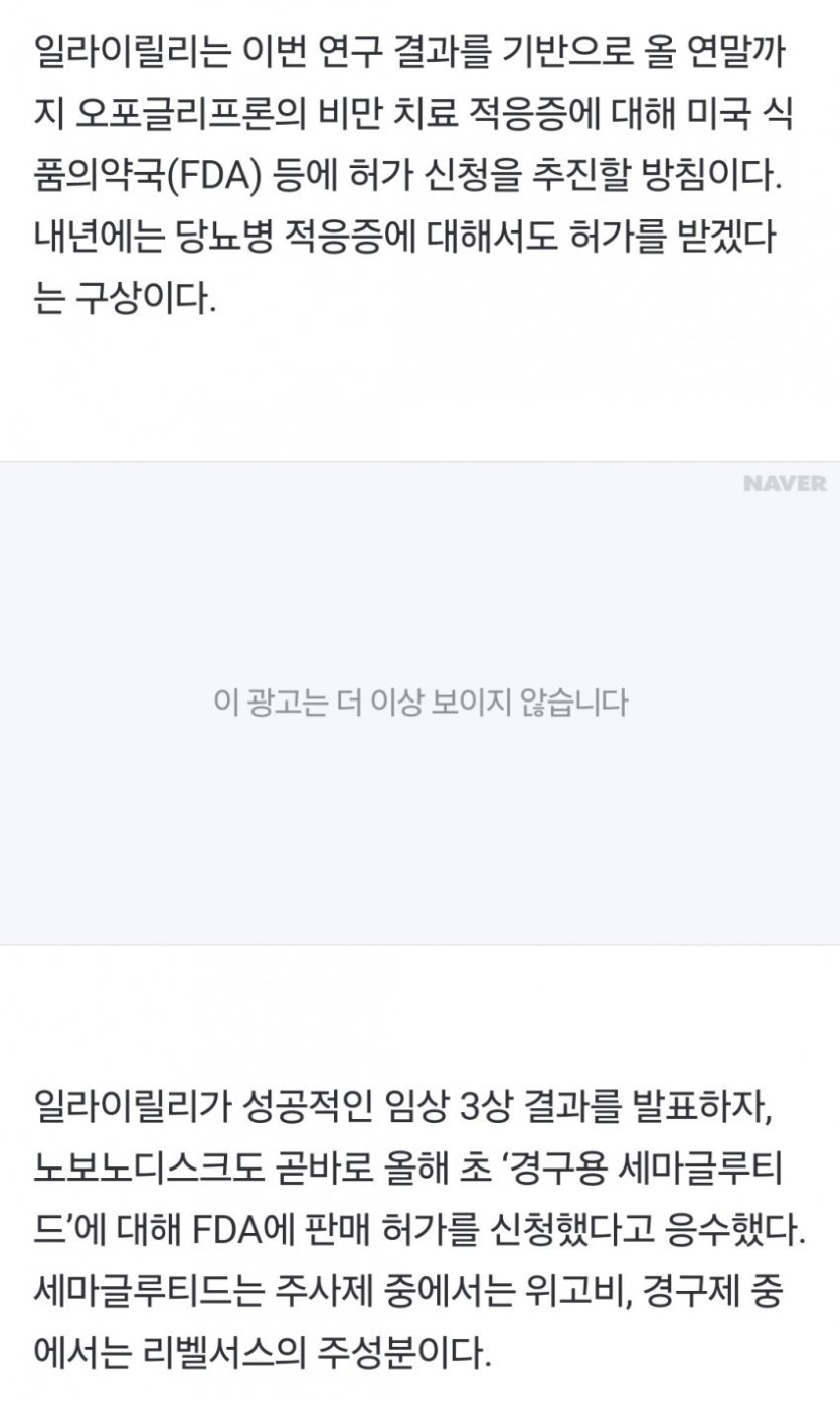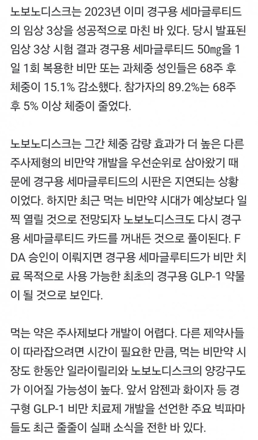 • 일라이릴리의 경구용 비만치료제 '오포글리프론' 임상 3상 결과 체중 감량 효과가 확인되면서, 노보노디스크 또한 경구용 세마글루티드의 FDA 승인을 신청하며 경구용 비만치료제 시장 경쟁이 본격화되고 있다.