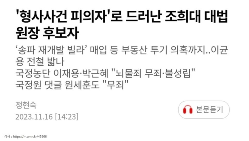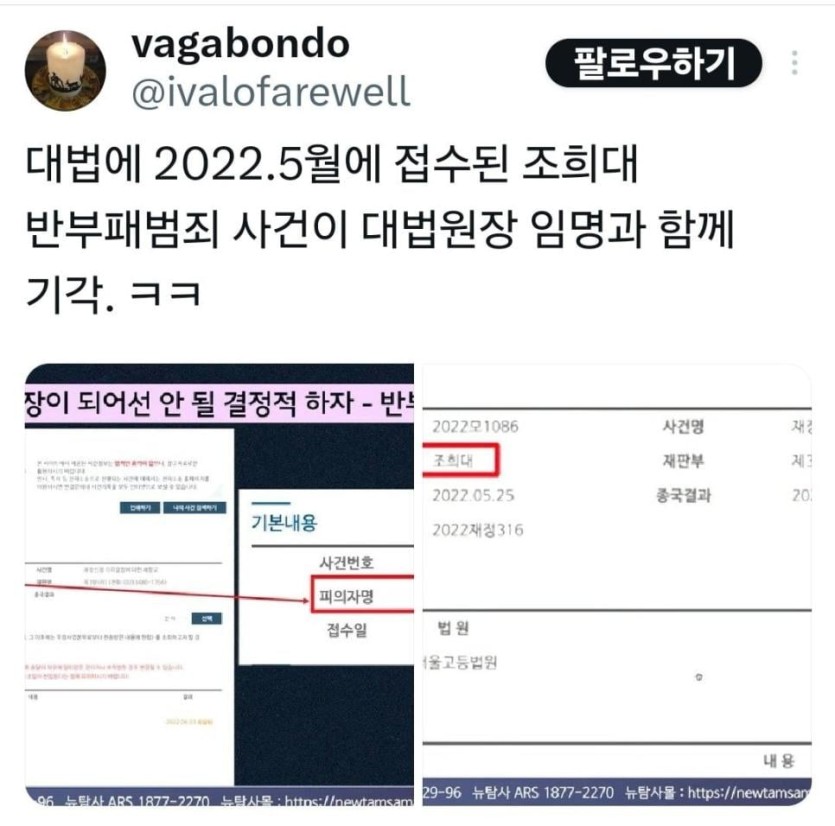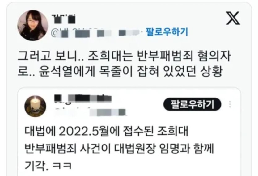 반부패 범죄 피의자였던 조희대 대한민국 대법원장 rh1 0 96 0 2025.05.06 12:00 경상북도 경주 출신 57년생클리앙 펌http://m.clien.net/service/board/park/18969827?od=T31&po=0&category=0&groupCd=community 0