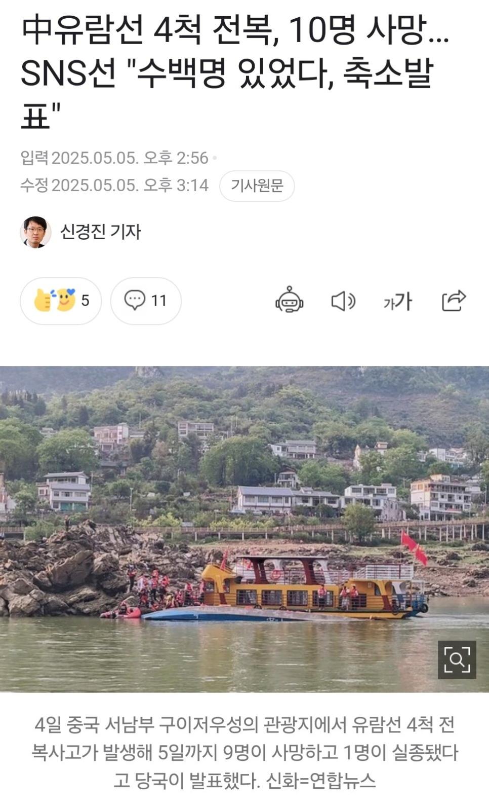 중국)유람선 전복으로 10명 사망... 하지만