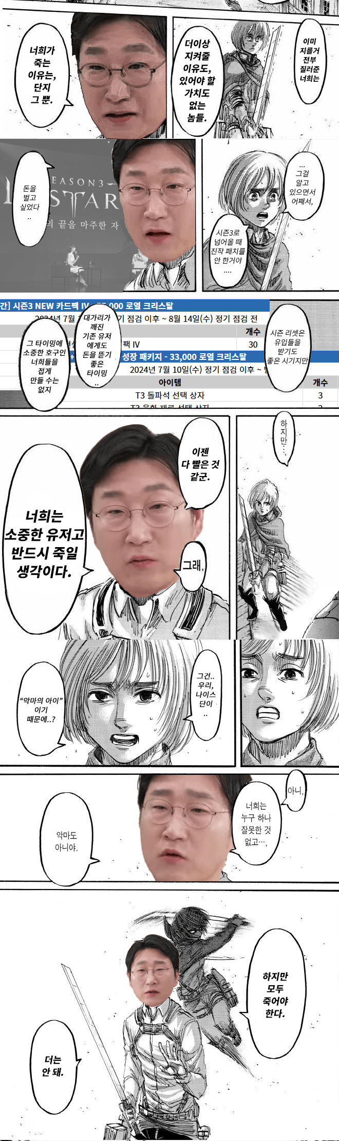 (※ 나이스단 : 비싼 가격 때문에 효율을 위해 본캐와 같은 직업을 키우는 집단, 쌀먹도 많지만 최소 2개 이상 키우는 실유저층이 50% 이상) (로아 첫 에스더 8강 무기 보유자 전섭 1위, 카멘 더 퍼스트 1위 방울토마토라면의 일갈) 1.로스트아크는 오픈부터 현재까지 약 7년동안 특정 유저층 혹은 전체 유저층을 (리셋,너프,완화) 희생시켜 매출을 얻는 법을 고수 해왔다. 2.처음에는 사람들이 이해를 해줬지만 7년동안 변화는 없었고 특히 시즌3부터 게임이 전보다 비싸지고 시즌3 오픈 전부터 유저들이 제기했던 문제를 방치로 일관하다 문제가 고름이 되어 터질 때 마다 라이브 방송을 켜 완화,수정을 진행해 코어 유저들에게 부담을 일으키는 행위를 계속 반복하여 사람들의 인내심에 한계가 오기 시작했다. 3.그리고 최근 대두되고 있던 여러 문제를 해결하긴 커녕 개발자들의 특정 유저층 갈라치기 방조 패치 선언이 트리거가 되어 현재 대규모 유저 이탈, 인게임 경제 붕괴, 유명 유저들의 소신발언,이탈 등으로 로스트아크 개발진은 유저들에게 완전히 신뢰를 잃었다.