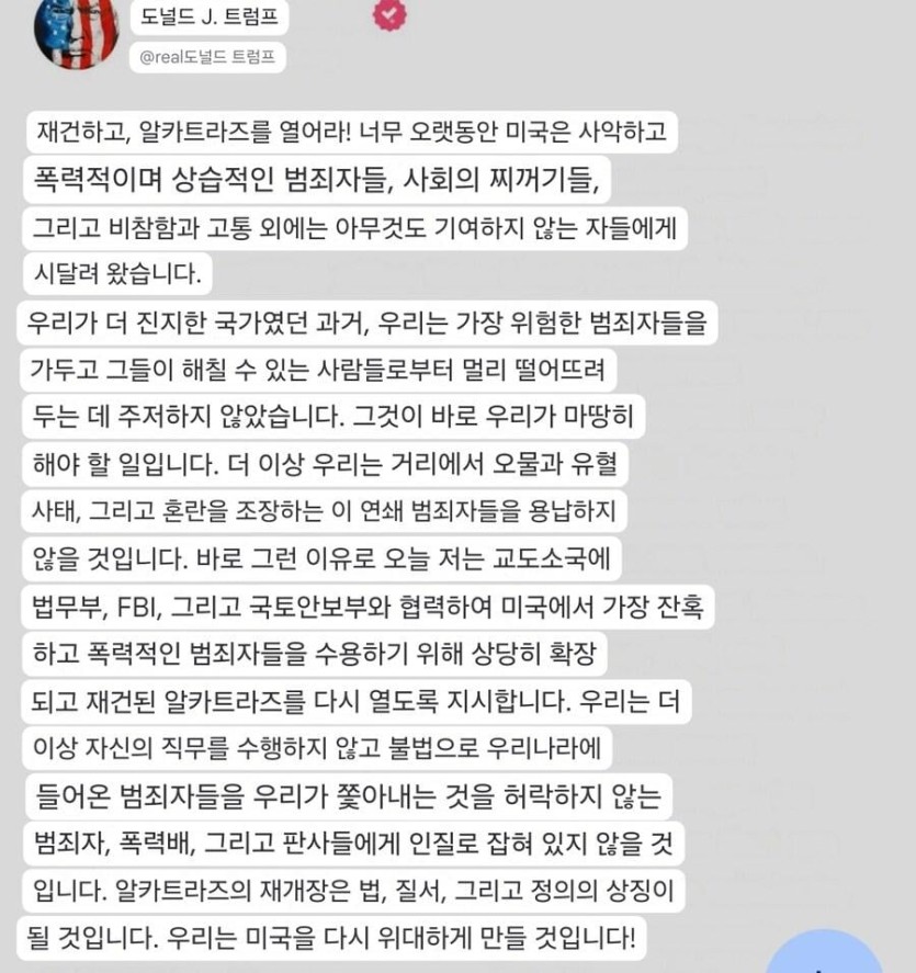트럼프 "폐쇄된 앨커트래즈 교도소 재개소 지시…중범죄자 수감"