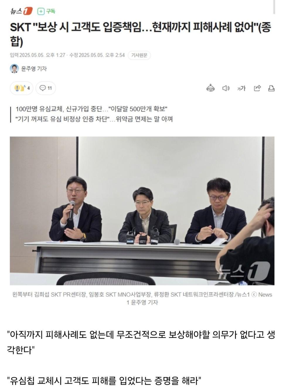 SKT에서 이번 유심사태 보상시 고객도 입증책임도 있다고 발표함.NEWS rh1 0 267 0 2025.05.05 18:15 따라서 피해배상은 고객의 책임이 일절없다는것을 고객 스스로가 증명해야한다고 발표함그리고 저발표듣고 기자가 머리 감싸고 엎어진게 백미 위약금 면책조항은 뭉개고 피해는 피해자한테 입증시키면서 회사 변호인단 상대해야함 역시 이새끼들 변하질 않는다니까 0