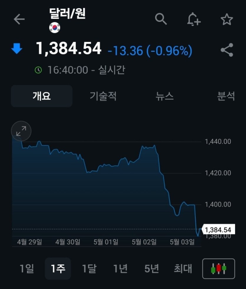 난리난 원달러 환율 근황 rh1 0 96 0 2025.05.05 18:15 아니, 오늘 휴일인데도 외환시장은 열리나 보네요? 오늘도 환율은 13원이상 급락중 무슨일이 있나요? 난리난 원달러 환율 근황 0