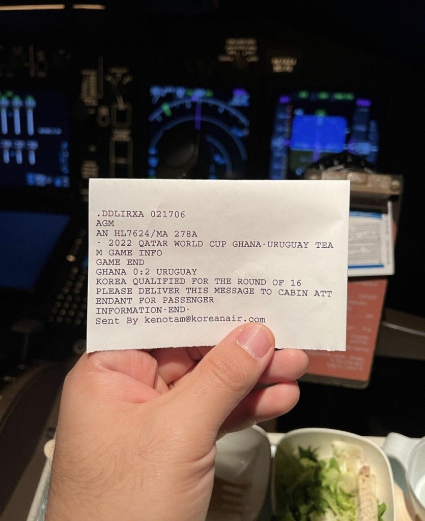 카타르 월드컵 당시 대한항공 조종사가 받은 메시지 rh1 0 103 0 2025.05.05 14:15 16강 진출 확정 직후 NOTAM(쉽게말해 항공용 공지사항)으로 기내에 이 사실을 전해달라는 대한항공의 메시지가 전달됨 낭만보소... 카타르 월드컵 당시 대한항공 조종사가 받은 메시지 0