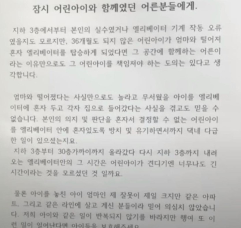 엘리베이터 혼자 탄 36개월 아이에 엄마가 입주민들한테 쓴 글.jpg