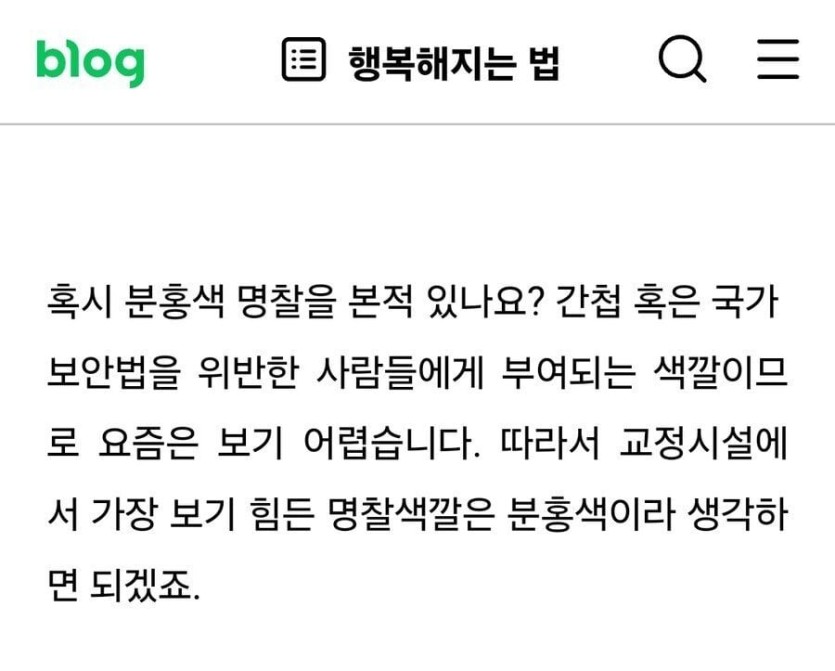 교도소 죄수명찰 색의 종류 rh1 0 193 0 2025.05.05 12:15 빨간색 - 사형수 하얀색 - 일반 기결수 or 미결수 파란색 - 마약사범 노란색 - 5대 강력범, 관요시찰자(관찰 대상), 징역 10년 이상 구형 미결수 (법무부 공식 블로그, 행법이) 분홍색 - 간첩, 국가보안법 위반 등 공안사범 교도소 죄수명찰 색의 종류 0