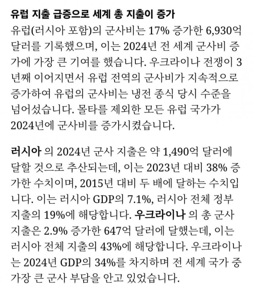 2024년 국방비 지출 순위 10개국 rh1 0 257 0 2025.05.05 11:15 특이할점 1.유럽의 국방비를 전부 합쳐도 미국보다 안씀 2.포브스, 뉴욕타임즈등 여러 언론이 지적했듯 중국의 국방비는 표면적인 국방비보다 훨씬 많을 가능성이 매우 높음 3.러시아는 GDP의 7퍼센트, 우크라이나는 GDP의 34%를 국방비로 쓰고있음. 러시아는 아직 부분 동원령, 우크라이나는 총동원령이라는 게 이렇게 차이나는듯. 체급자체가 차이나니까 어쩔수없지만.... 4.독일은 국방비를 800억 달러 넘게 쓰는데 유의미한 전력증강이 거의 이루어지지 않음 2024년 국방비 지출 순위 10개국 0