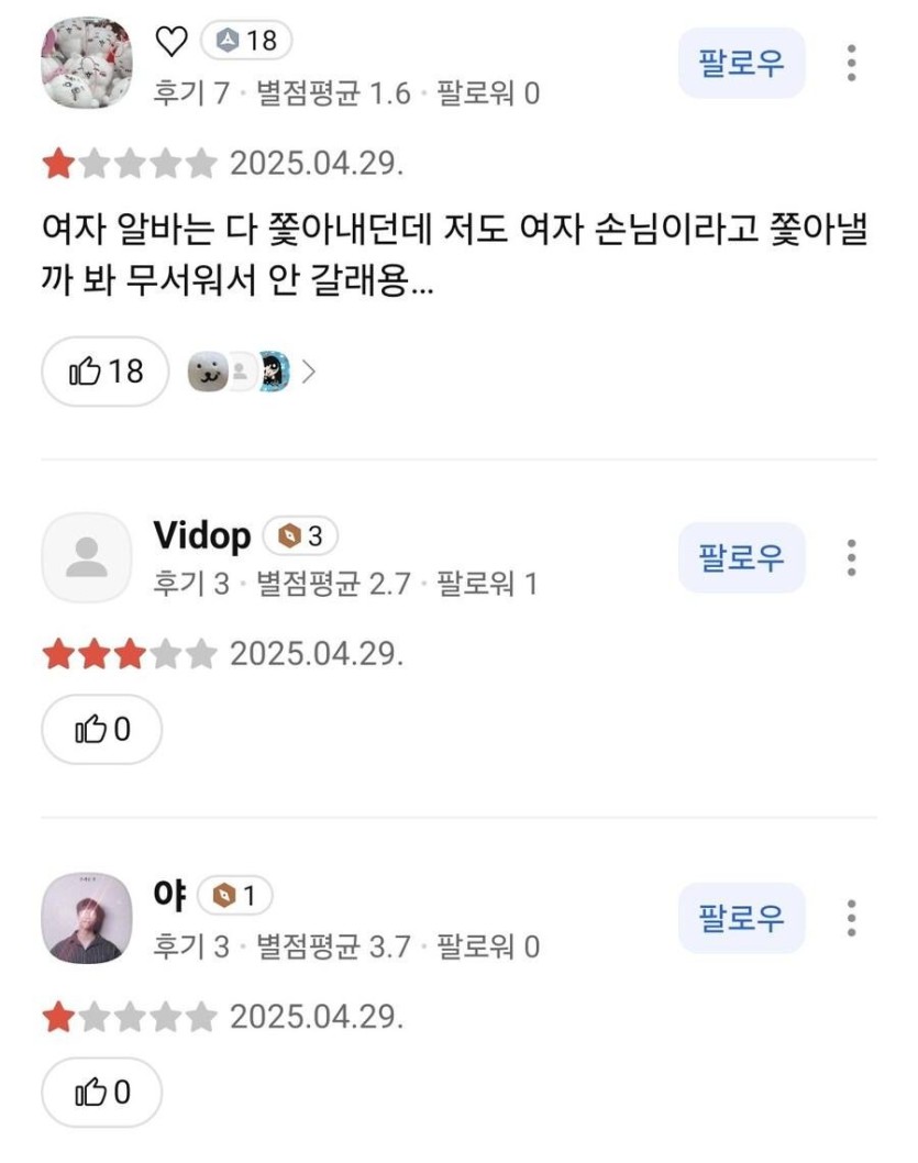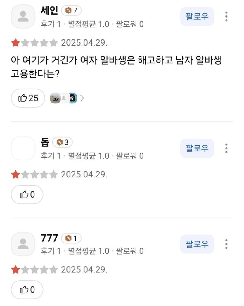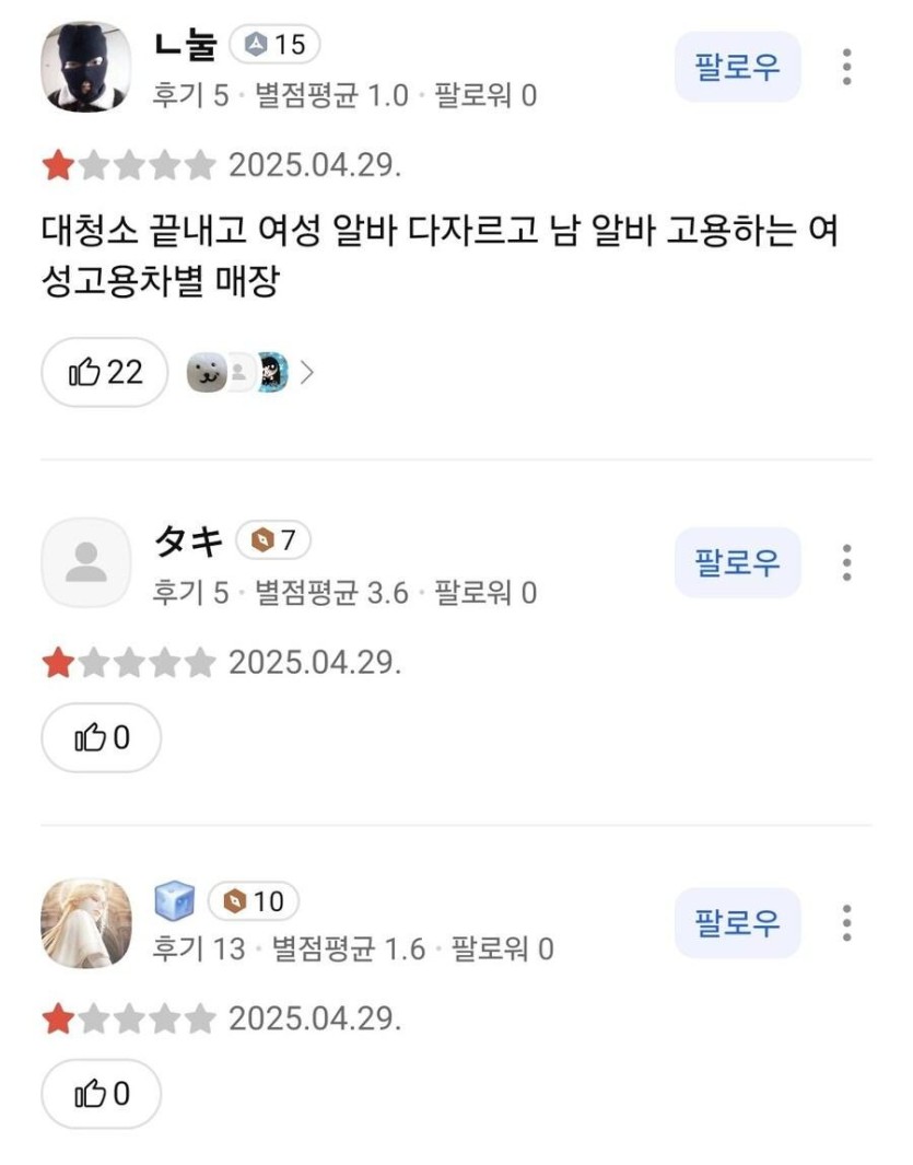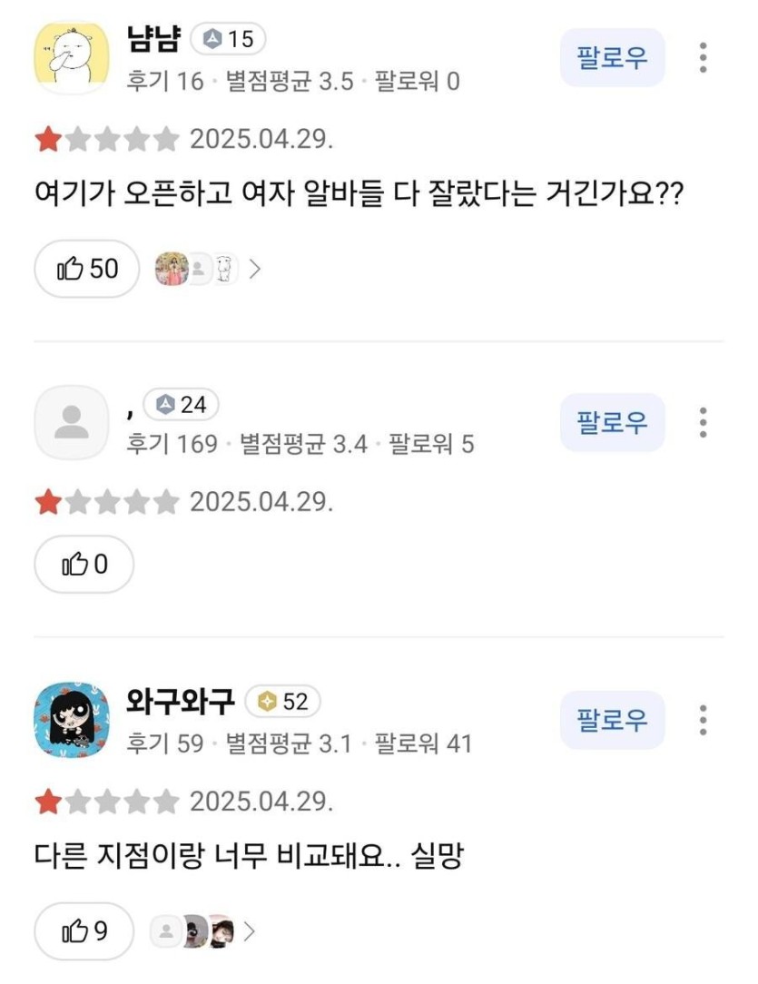 허위사실로 별점 테러당한 안산 쿠우쿠우에 달린 리뷰 rh1 0 108 0 2025.05.05 07:30 안산 쿠우쿠우 골드점에서 오픈 전에 여직원만 모아서 대청소 시킨 후 다 자르고 남직원만 고용했다고 허위사실 유포해서 좌표 찍고 별점 테러하게 만든 다음에 상황 심각해지니까 바로 계삭튀하고 런함사과라도 하던가 어떻게 이렇게 무책임할 수가 있지지금은 쿵쾅이들 때문에 평점 1점대임 0