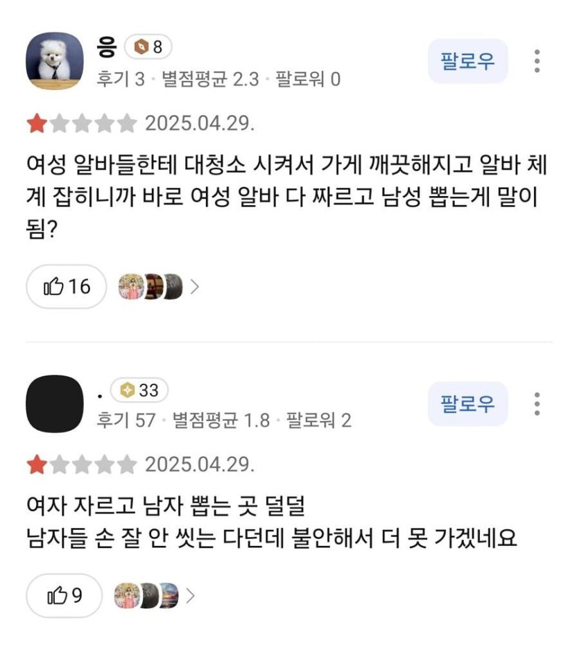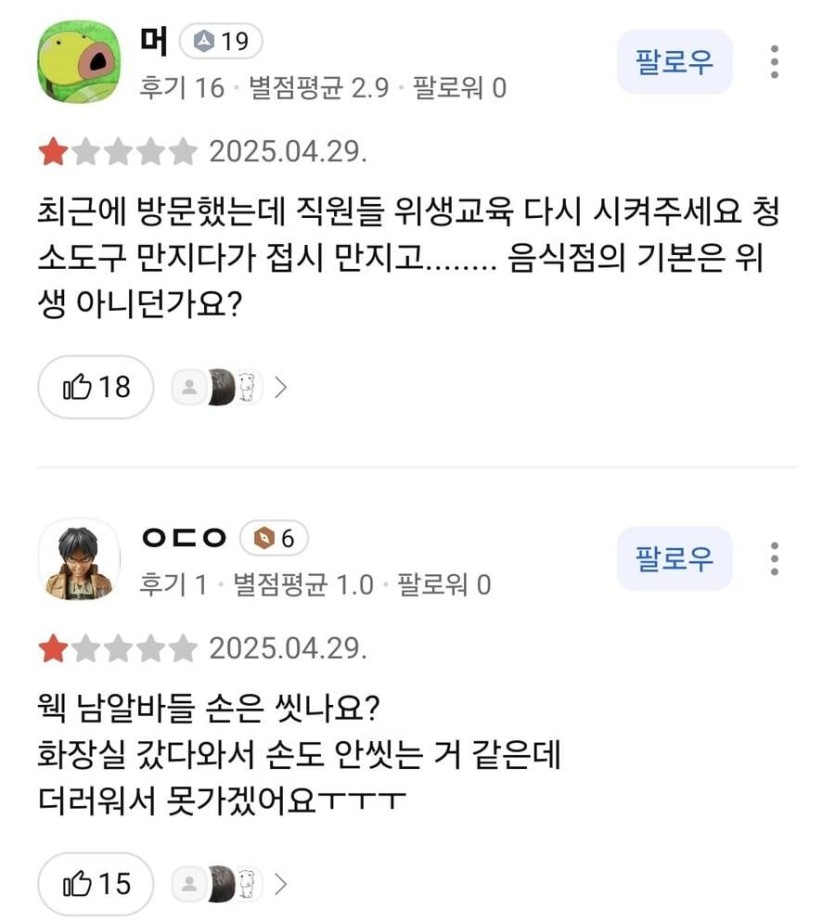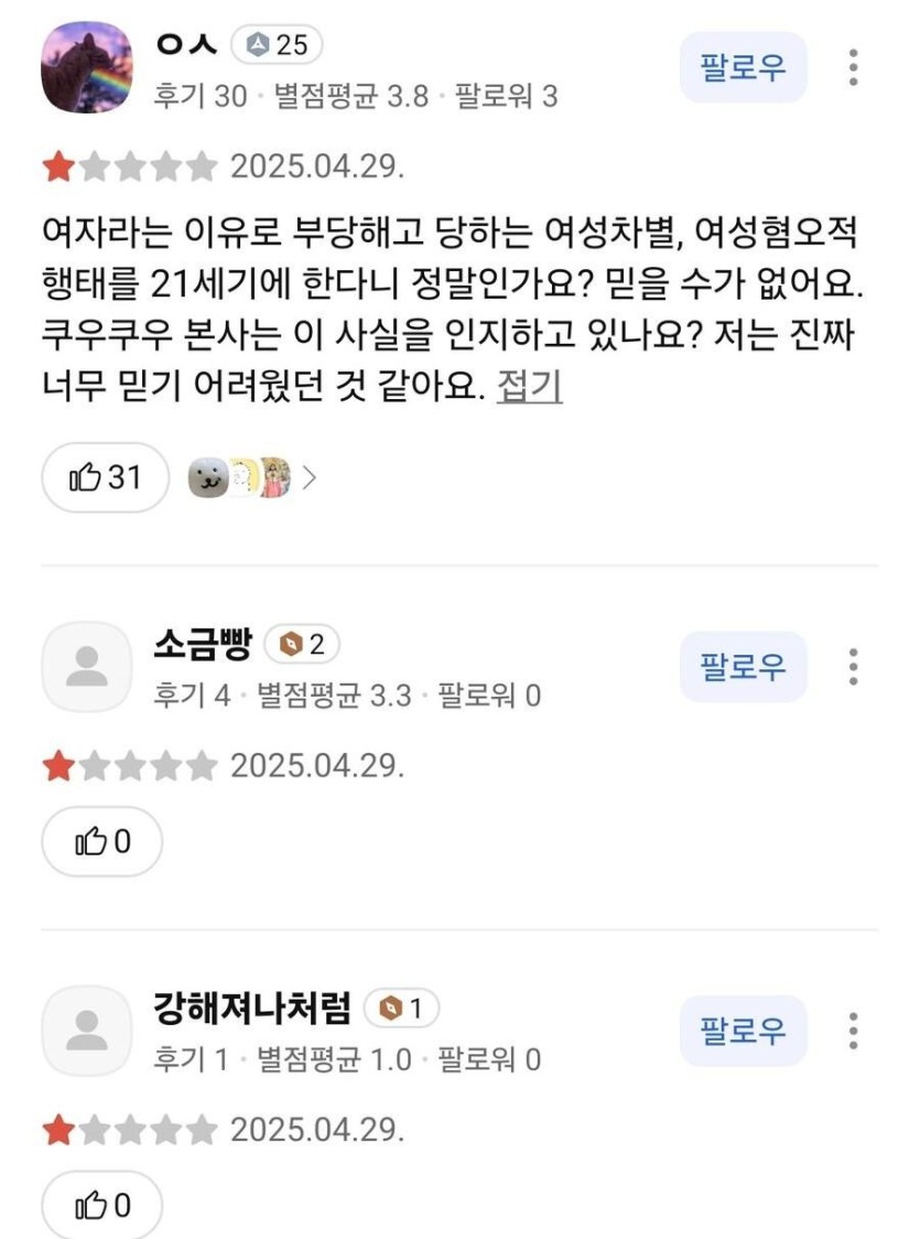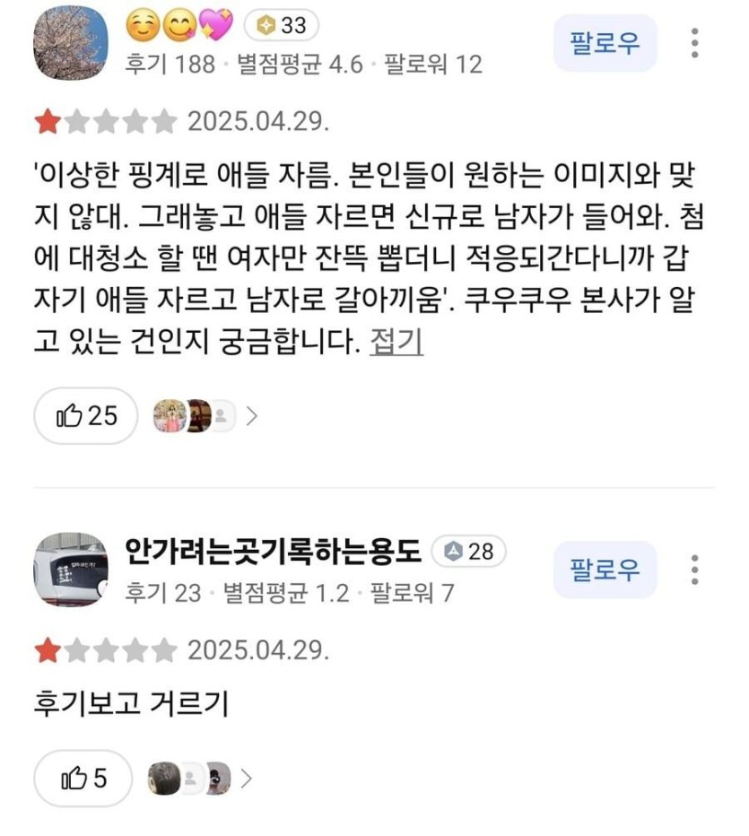 허위사실로 별점 테러당한 안산 쿠우쿠우에 달린 리뷰 rh1 0 108 0 2025.05.05 07:30 안산 쿠우쿠우 골드점에서 오픈 전에 여직원만 모아서 대청소 시킨 후 다 자르고 남직원만 고용했다고 허위사실 유포해서 좌표 찍고 별점 테러하게 만든 다음에 상황 심각해지니까 바로 계삭튀하고 런함사과라도 하던가 어떻게 이렇게 무책임할 수가 있지지금은 쿵쾅이들 때문에 평점 1점대임 0