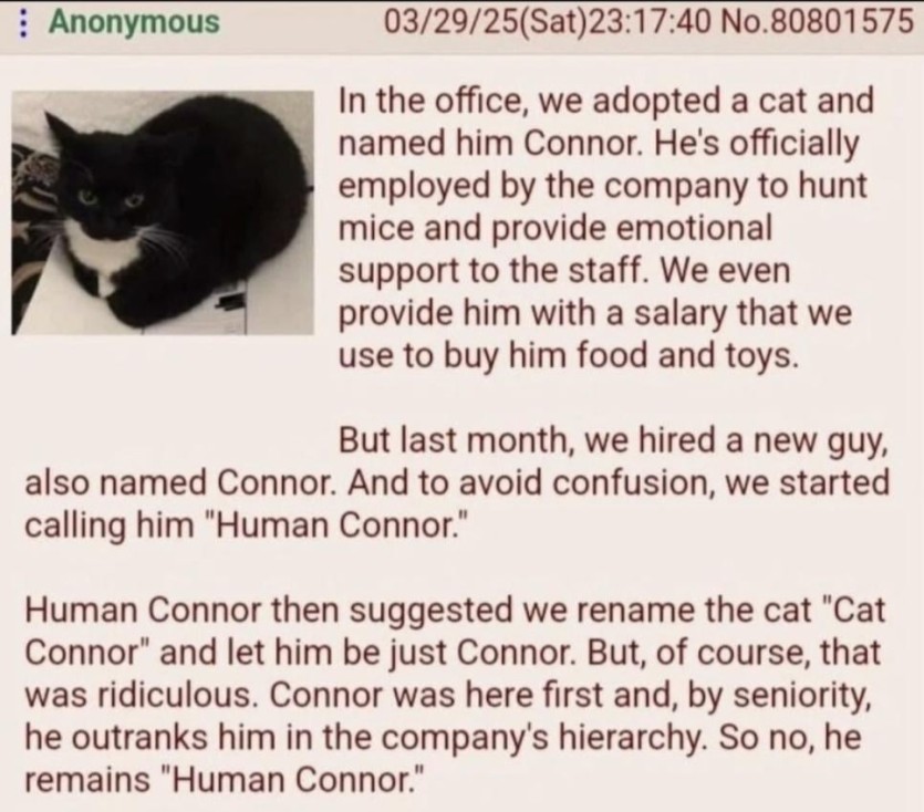 우리 회사는 고양이를 입양했고 코너라는 이름을 붙여줌.