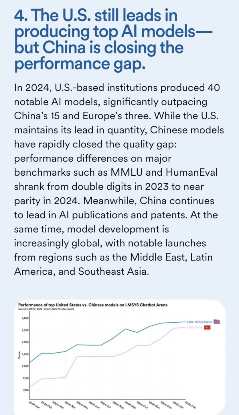 몇년전부터 미국과 중국이 다른 국가 대비 인공지능이 넘사벽이었지만 미국과 중국 사이에도 큰 격차가 1년전만해도 존재했음. 그러나 이제 점수로 미국 모델이 1385점 중국 모델이 1362점으로 중국 모델이 미국 모델의 98% 수준.