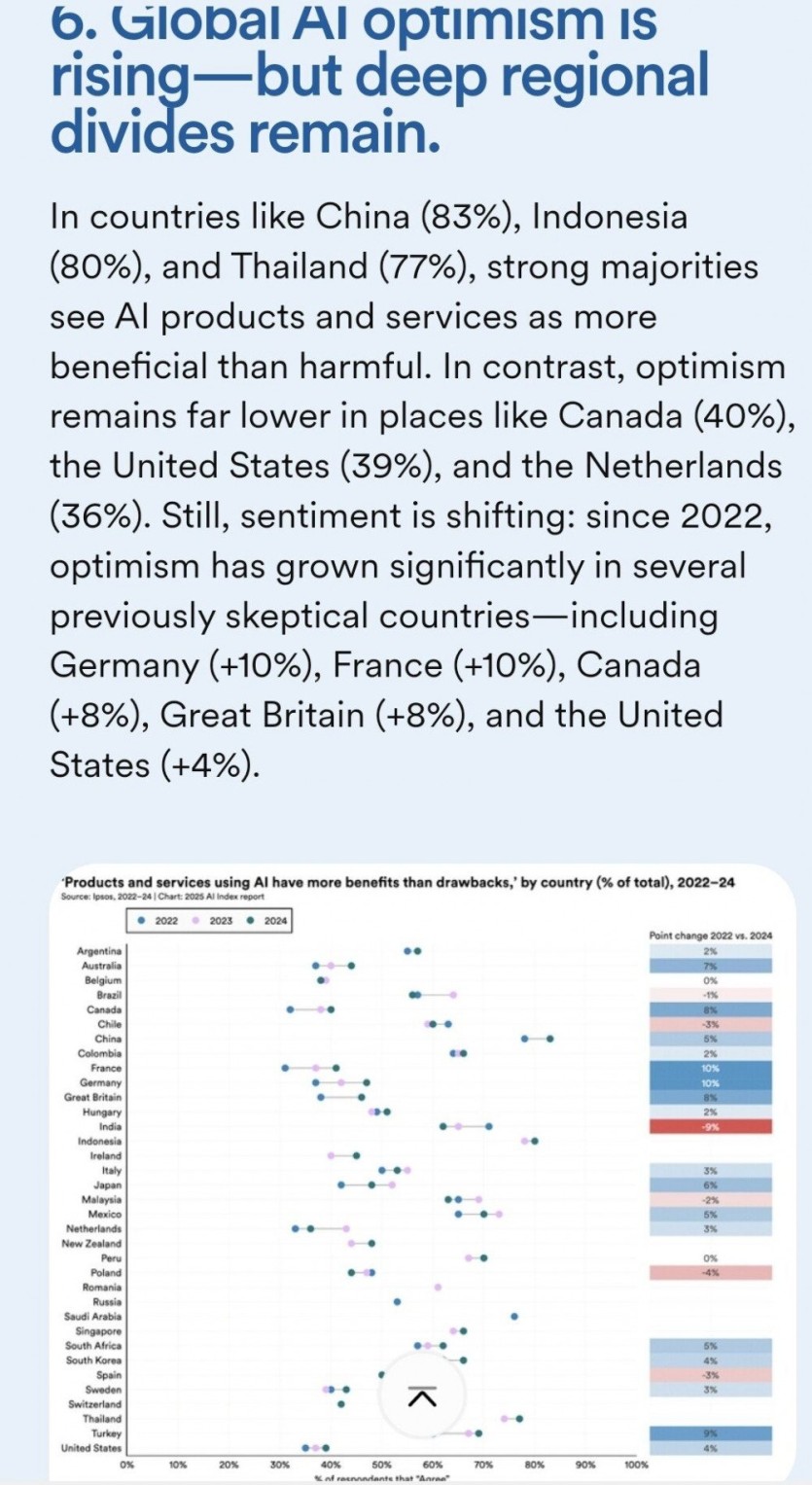 현재 세계 인공지능을 주도하는 국가라는것과 정반대로 주요국중 인공지능에 대해서 가장 비관적이고 회의적인 의견을 보이는게 미국임.