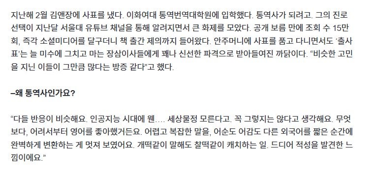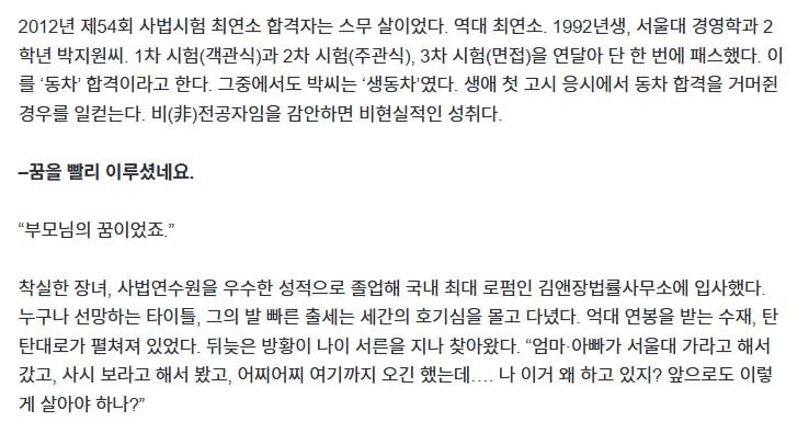 사법시험 최연소 합격-김앤장 변호사 rh1 0 97 0 2025.05.04 17:15 서울대 경영학과 2학년 재학때, 사법시험 최연소 합격-김앤장 변호사퇴사후,통역사 이직 적성에 맞고 행복하다함 사법시험 최연소 합격-김앤장 변호사 0
