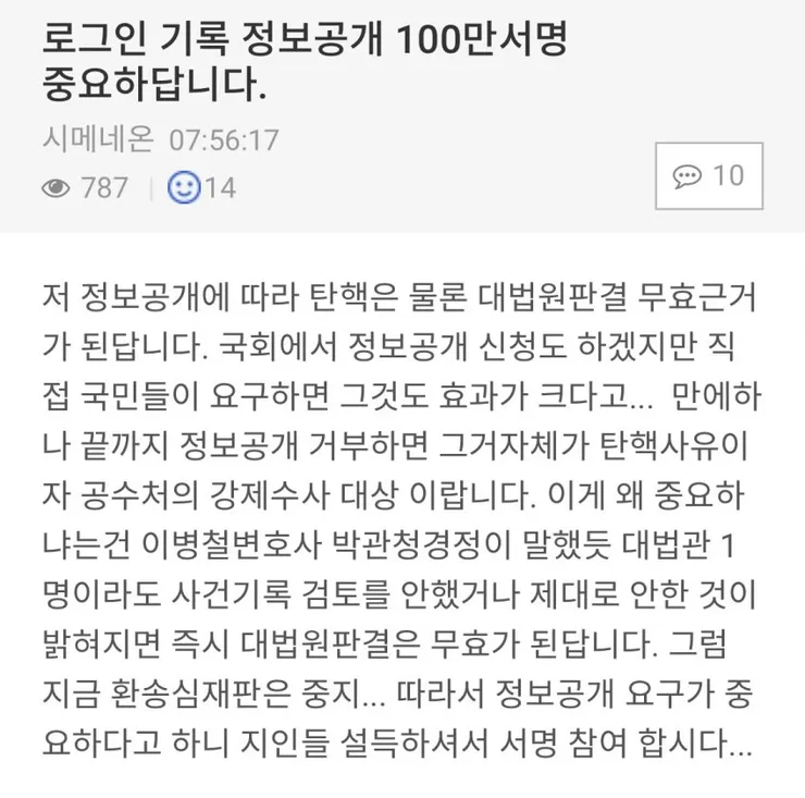펌] 로그인 기록 정보공개 100만 서명 중요하답니다.jpg rh1 0 115 0 2025.05.04 15:15 https://docs.google.com/forms/d/e/1FAIpQLSdEE6x3Zb4cJoxOdNTLw0ccbaxWH_y-rNvrtmJn-eQez2Ouww/viewform 0