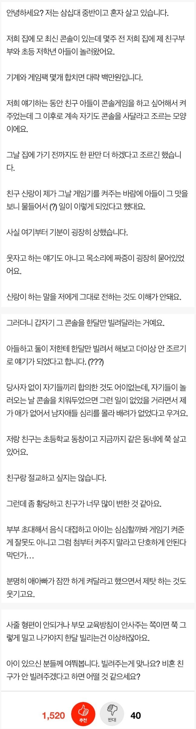 친구 아들 게임기 논란 rh1 0 97 0 2025.05.04 15:15 1. 친구 가족 초대해서 음식 대접하고 2. 친구 아들 게임 한판 시켜줌 3. 게임기 한 달만 빌려달라고 함 어떻게 하시나요? 친구 아들 게임기 논란 0