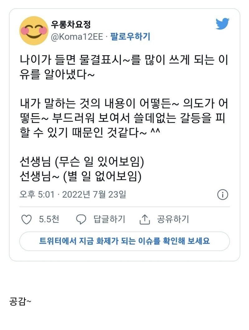나이가 들면 물결 표시~를 많이 쓰게 되는 이유 rh1 0 139 0 2025.05.04 09:15 ex) 수고하세요 (X) 수고하세요~ (O) 나이가 들면 물결 표시~를 많이 쓰게 되는 이유 0