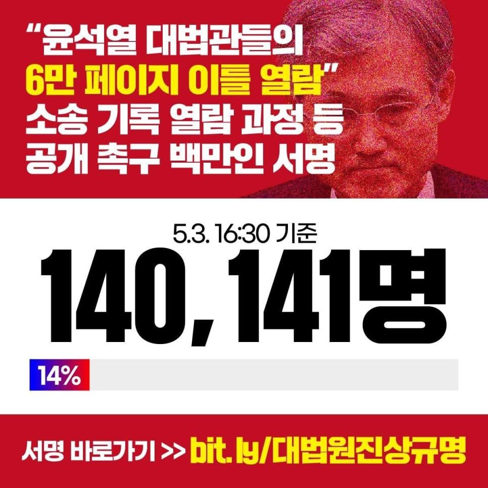 현재 열람기록 공개촉구 서명 14만명 돌파.jpg rh1 0 191 0 2025.05.03 18:15 서명https://docs.google.com/forms/d/e/1FAIpQLSdEE6x3Zb4cJoxOdNTLw0ccbaxWH_y-rNvrtmJn-eQez2Ouww/viewform널리 알립시다 0