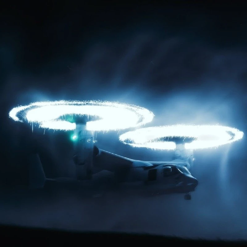 사막에서 운용될때 지상에서 모래가 공중에 날리면 헬리콥터의 로터를 보호하기 위해 가해진 티타늄 코팅이 미세하게 마모되며 산화를 일으켜 빛을 냄