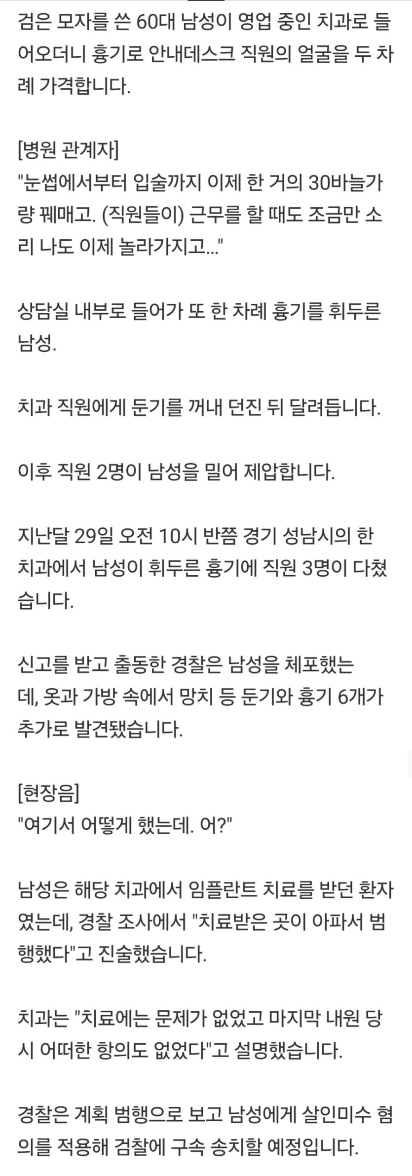 치과 찾아가 흉기 난동 3명 부상