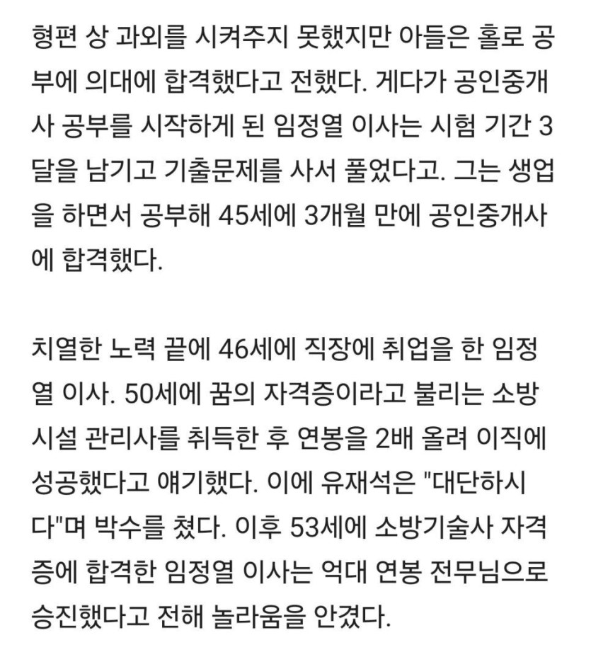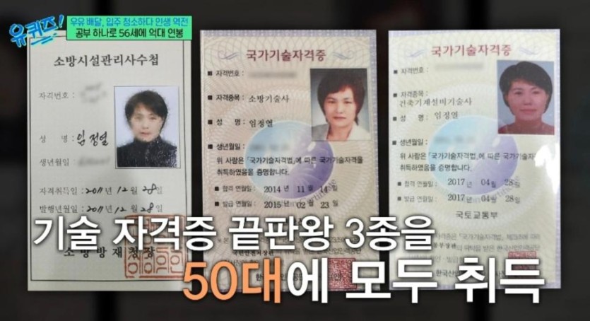 우유배달하던 50대 주부, 자격증 3종으로 억대 연봉 꿈 이뤘다. jpg rh1 0 155 0 2025.05.02 21:15 소방시설관리사, 소방기술사, 건축기계설비기술사 3종 자격증을 50대 나이에 취득아들이 의사라고 ㄷㄷ 0