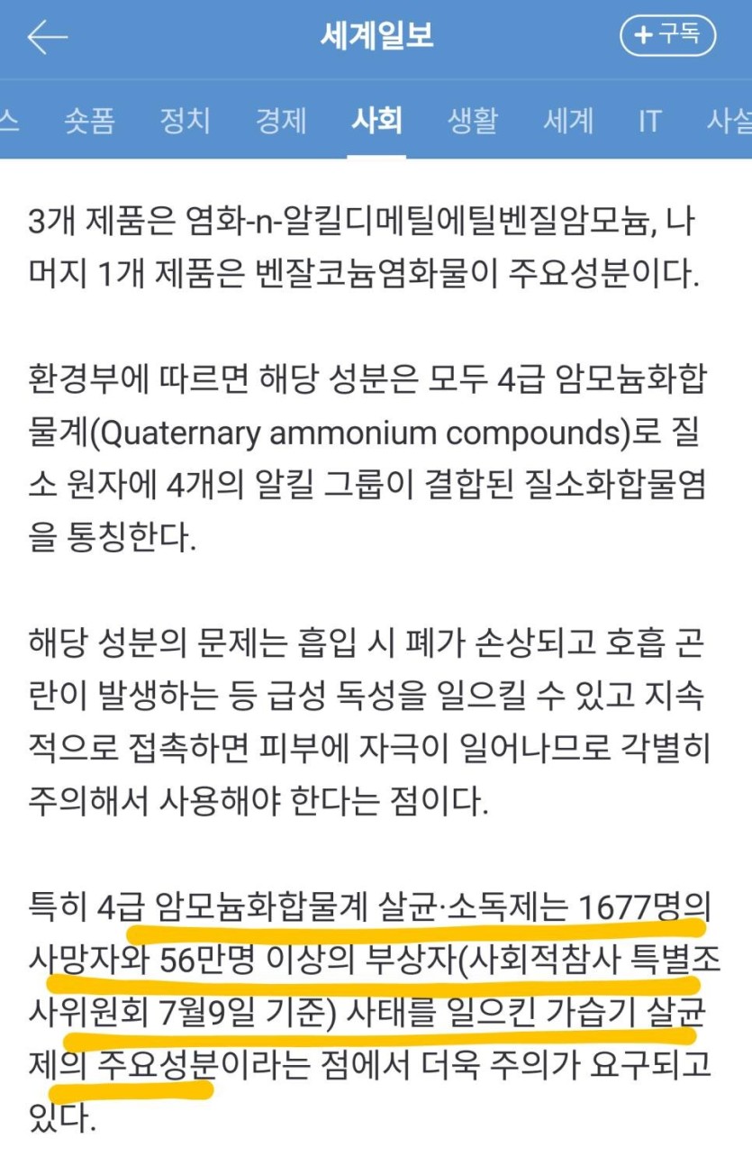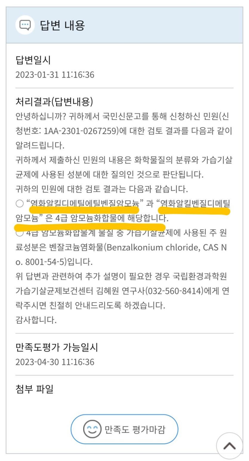 3. 인터넷 검색만 해봐도 4급암모늄 염화벤잘코늄이 가습기살균제 성분일 뿐만아니라, 참사의 원인성분이며 폐로 흡입 시 치명적인 독성물질임을 알 수 있음.