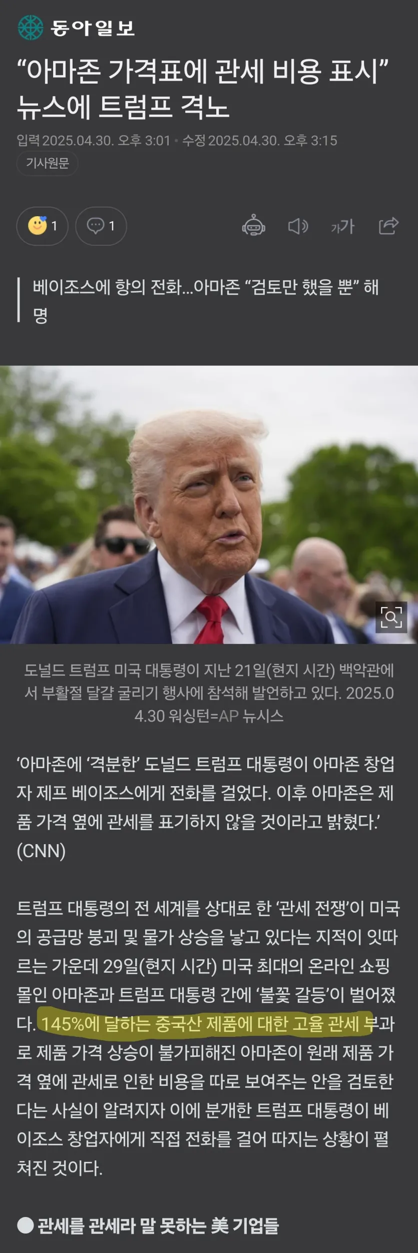 아마존 '관세비' 표시 검토... 트럼프 격노