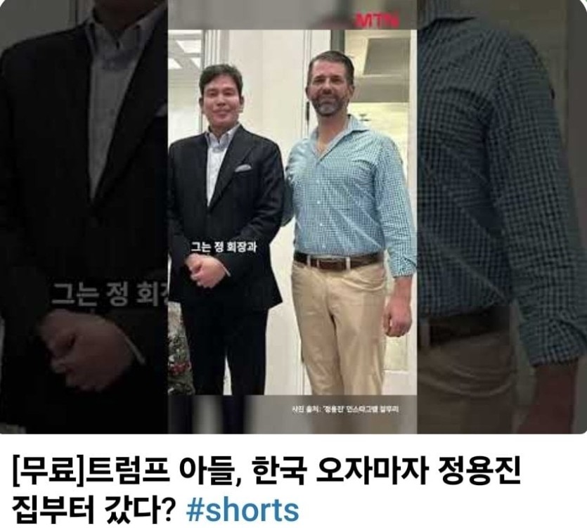 어제 한국에 왔다는 트럼프 아들 rh1 0 113 0 2025.05.01 11:15 한국 오자 마자 정용진 집으로 직행, 그리고 강남 조선팰리스 호텔에서 잘거라고 용진이형이 외교관 이상의 역할을 하네요 ㄷㄷ 어제 한국에 왔다는 트럼프 아들 0