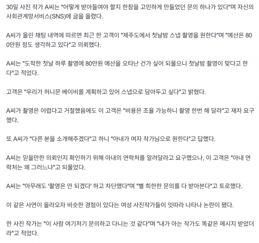 "800만원 줄테니 첫날밤 사진촬영 좀" 女사진작가에 문의