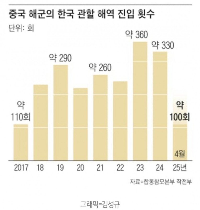 중국 군함의 우리 관할 해역 진입 횟수는 2017년 약 110회였지만, 이듬해인 2018년 230회로 2배 이상으로 급증했다. 미·중 패권 경쟁이 본격화하고 대만 해협 긴장감이 커지던 시기다. 2019년엔 290회에 달했으며 이후 2022년까지 200대 수준을 유지하다 2023년 360회로 대폭 증가했다. 2022년 시진핑 국가주석이 3연임을 여는 대관식 성격의 당대회에서 “대만 통일을 위해선 무력 사용도 불사하겠다”는 연설을 하면서 서해상 중국 군함 훈련이 확대됐기 때문이다. 중국은 서해를 한반도 유사시뿐 아니라 대만 해협 위기 상황까지도 고려한 전구(戰區)로 상정하는 것으로 군은 분석하고 있다.