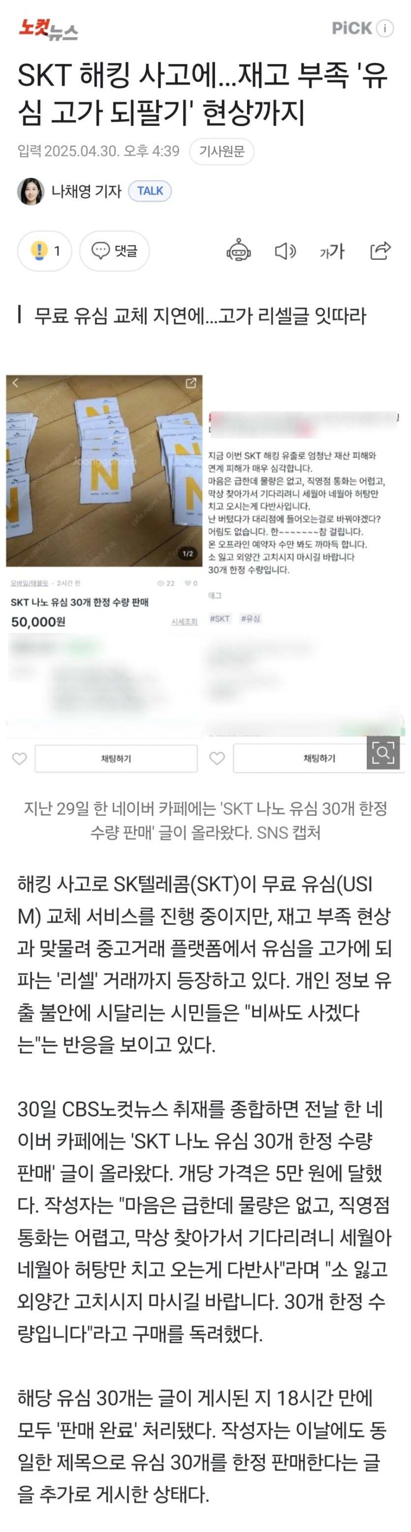 SKT 유심 재고 부족에 '유심 고가 되팔기' 현상까지