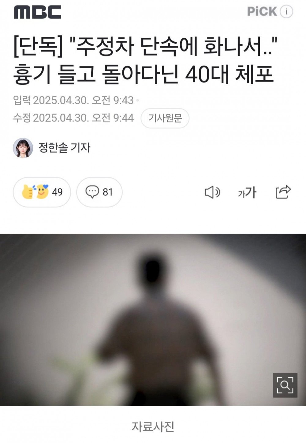 "주정차 단속에 화나서 " 흉기 들고 돌아다닌 남자