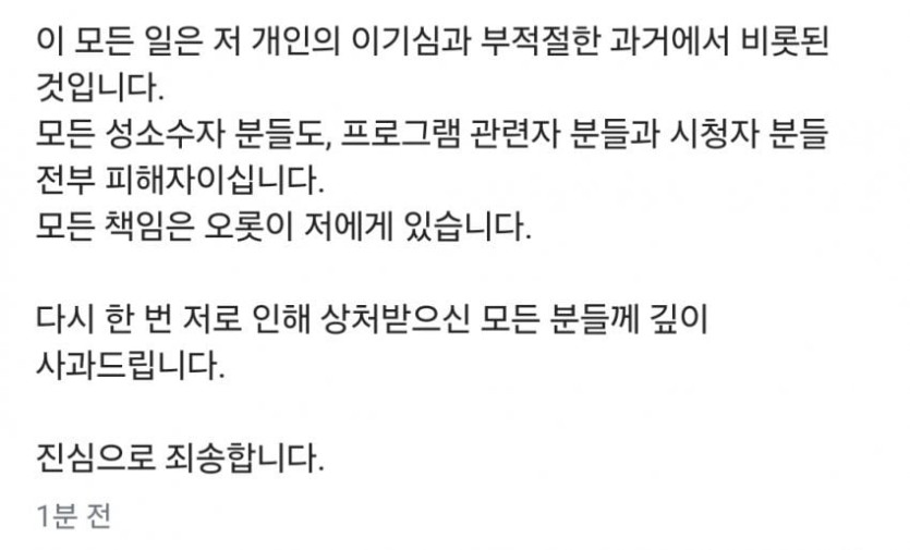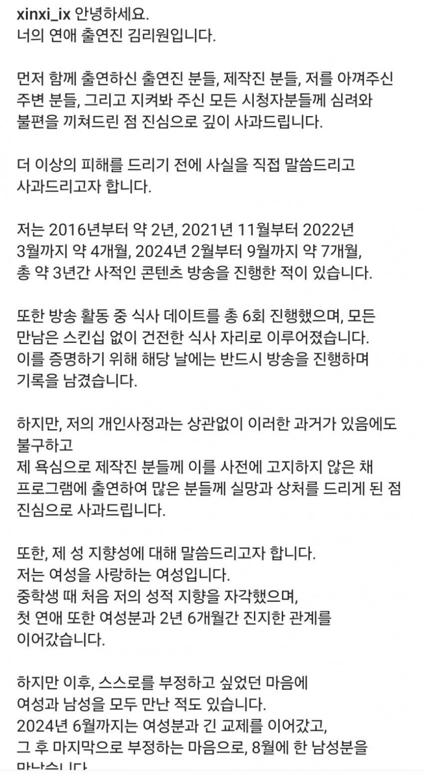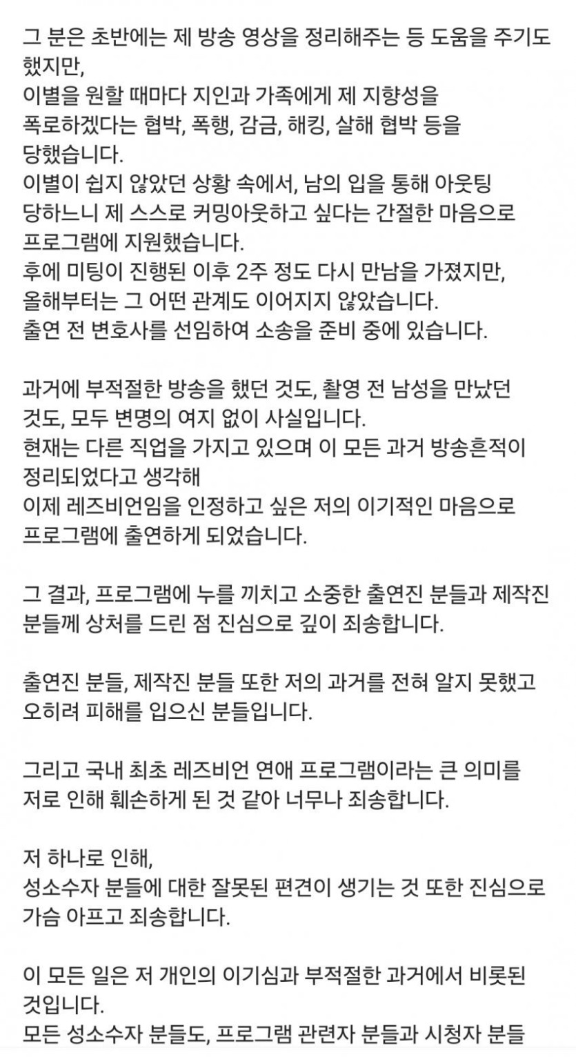 방금자 레즈비언 연애 프로 너의연애 출연자 리원 사과문