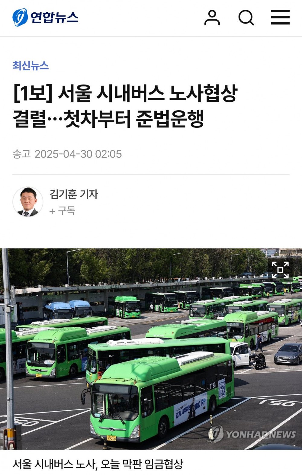 서울 시내버스 노사협상 결렬 rh1 0 103 0 2025.04.30 14:15 [1보] 서울 시내버스 노사협상 결렬…첫차부터 준법운행 | 연합뉴스 https://www.yna.co.kr/view/AKR20250430002700004 서울 시내버스 노사협상 결렬 0