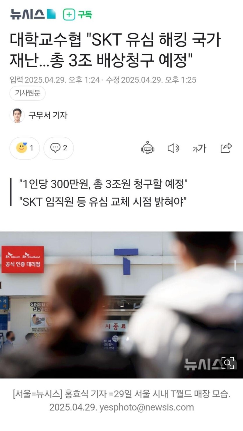 현재 skt 관련, 언론사 요청으로 삭제된 기사 rh1 0 99 0 2025.04.30 09:00 https://n.news.naver.com/mnews/article/003/0013212925https://biz.chosun.com/it-science/ict/2025/04/29/55Z227RI55BC3MKXIIEUGQ5OX4현재는 언론사 요청으로 삭제됨.하지만 누군가가 일부 스샷과 일부 기사를 퍼놨음 한국대학교수협의회(한교협)는 29일 SK텔레콤의 유심 해킹 사태를 "국가재난"으로 규정하고, 집단 손해배상을 청구하겠다고 밝혔다.한교협은 2300만 가입자의 개인정보 및 금융 인증 정보 유출을 심각하게 보고, 최태원 회장의 공식 사과 및 문제 해결을 요구했다.만약 해결 노력이 없다면, 30만 교수와 가족 100만 명이 1인당 300만 원씩 총 3조 원 규모의 손해배상 소송을 제기할 계획이다.또한, 해킹 인지 후 임직원 유심 교체 시점 공개를 요구하며, 단순 무상 교체 대신 1인당 300만 원 수준의 실질적 보상안 마련을 촉구했다.Q) 다음중 무엇때문에 이 기사는 삭제됐을까?1. 최태원 회장의 공식 사과2. 3조원 손해배상 소송3. 해킹 인지 후 임직원 유심 교체 시점 공개를 요구4. 단순 무상 교체 대신 1인당 300만 원 수준의 실질적 보상 0