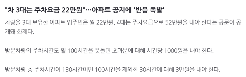 "차 3대 주차요금 22만원" 아파트 공지에 반응 폭발 ㄷ.jpg rh1 0 164 0 2025.04.29 08:00 https://n.news.naver.com/article/015/0005124501?ntype=RANKING 0